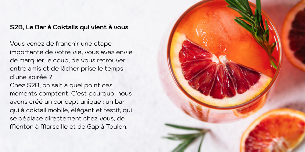 S2B propose un bar mobile avec barman professionnel, offrant une expérience cocktail haut de gamme et personnalisée à domicile ou en événement, alliant convivialité, élégance et savoir-faire.